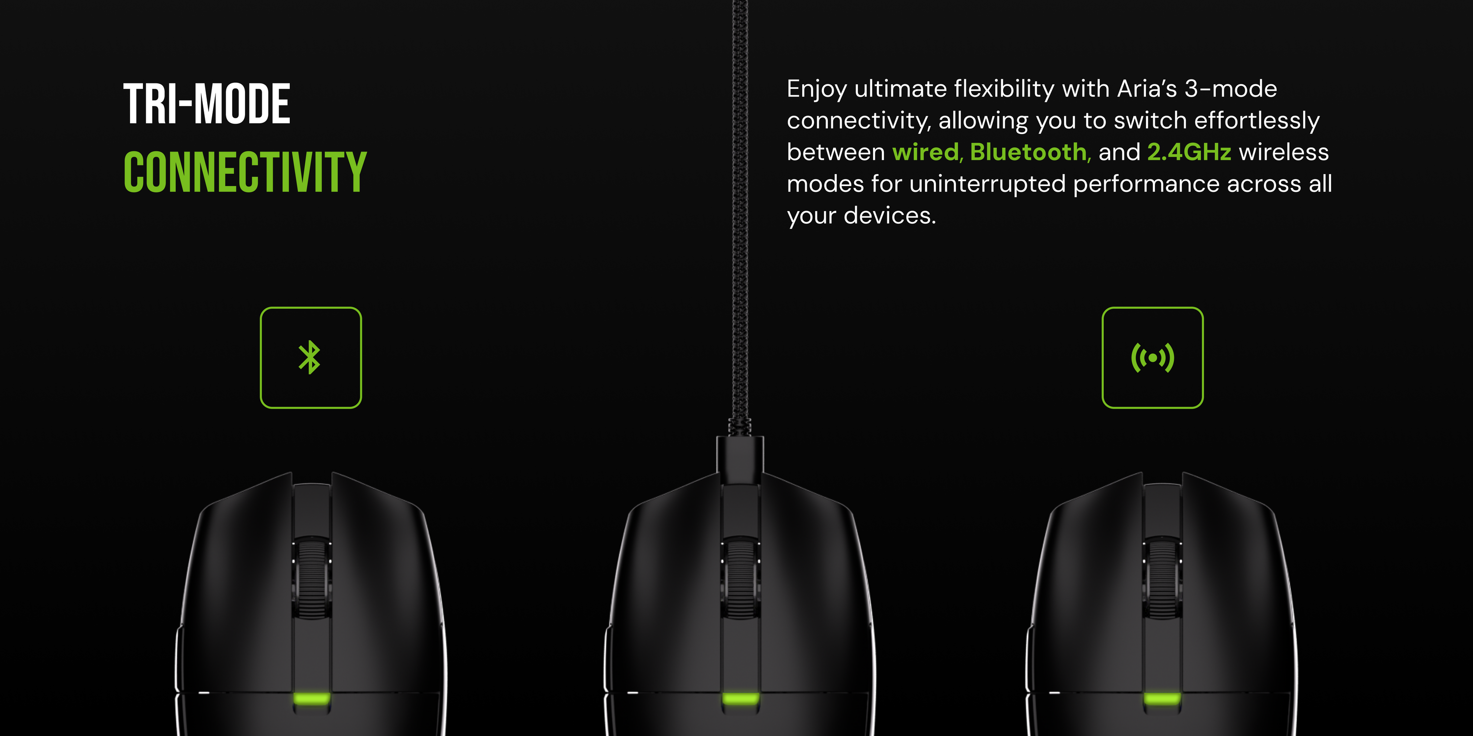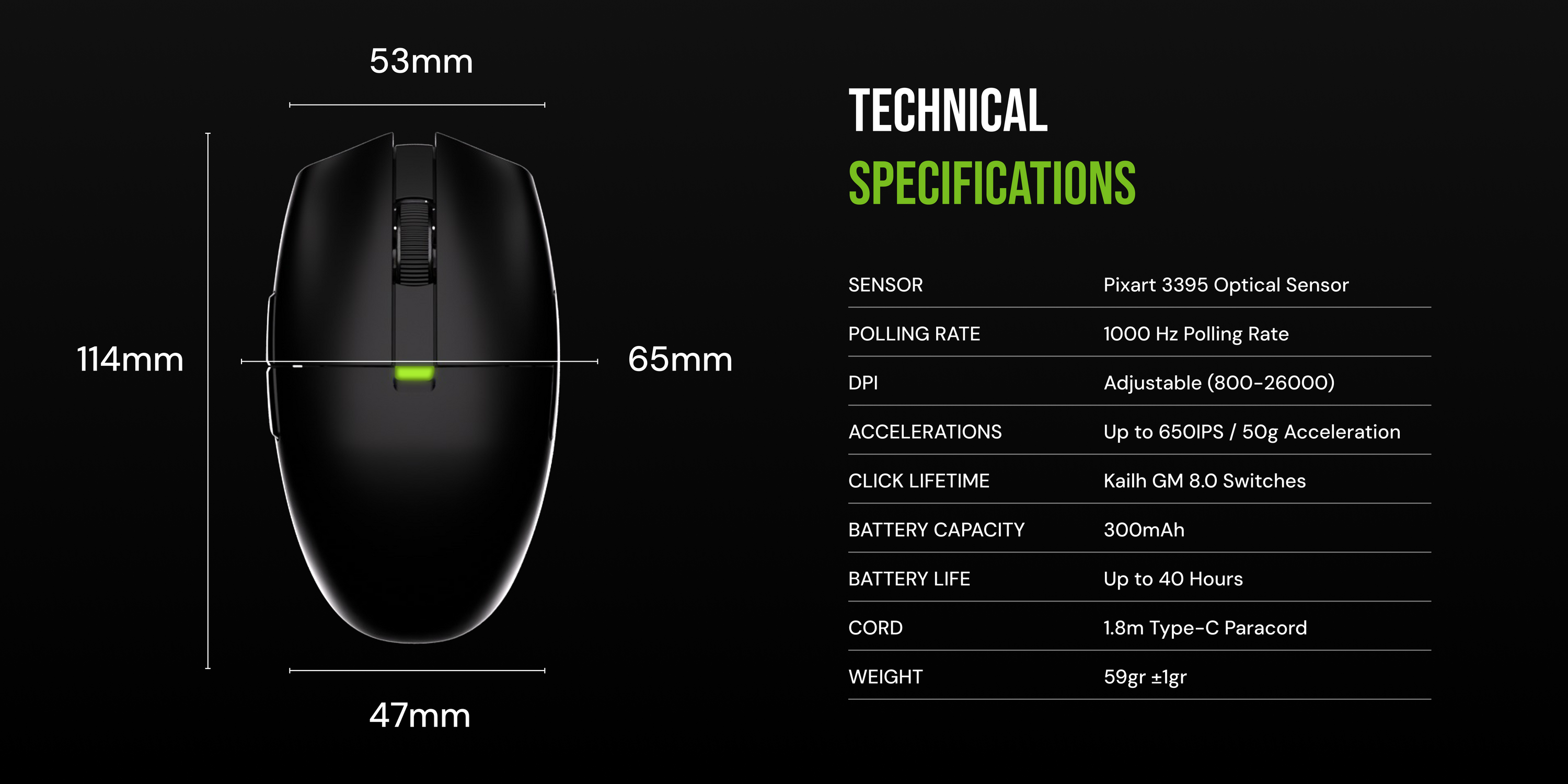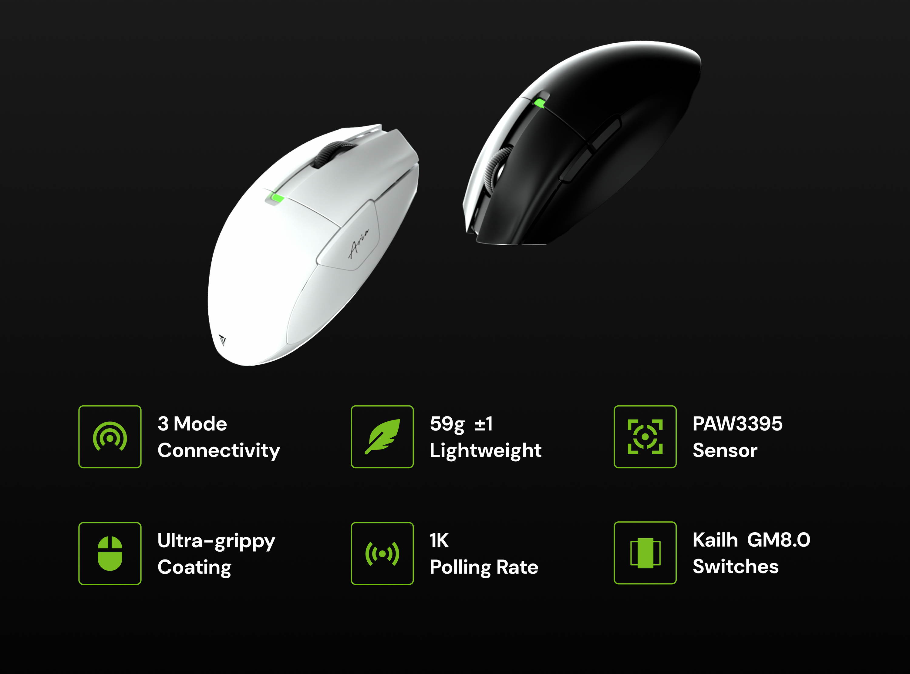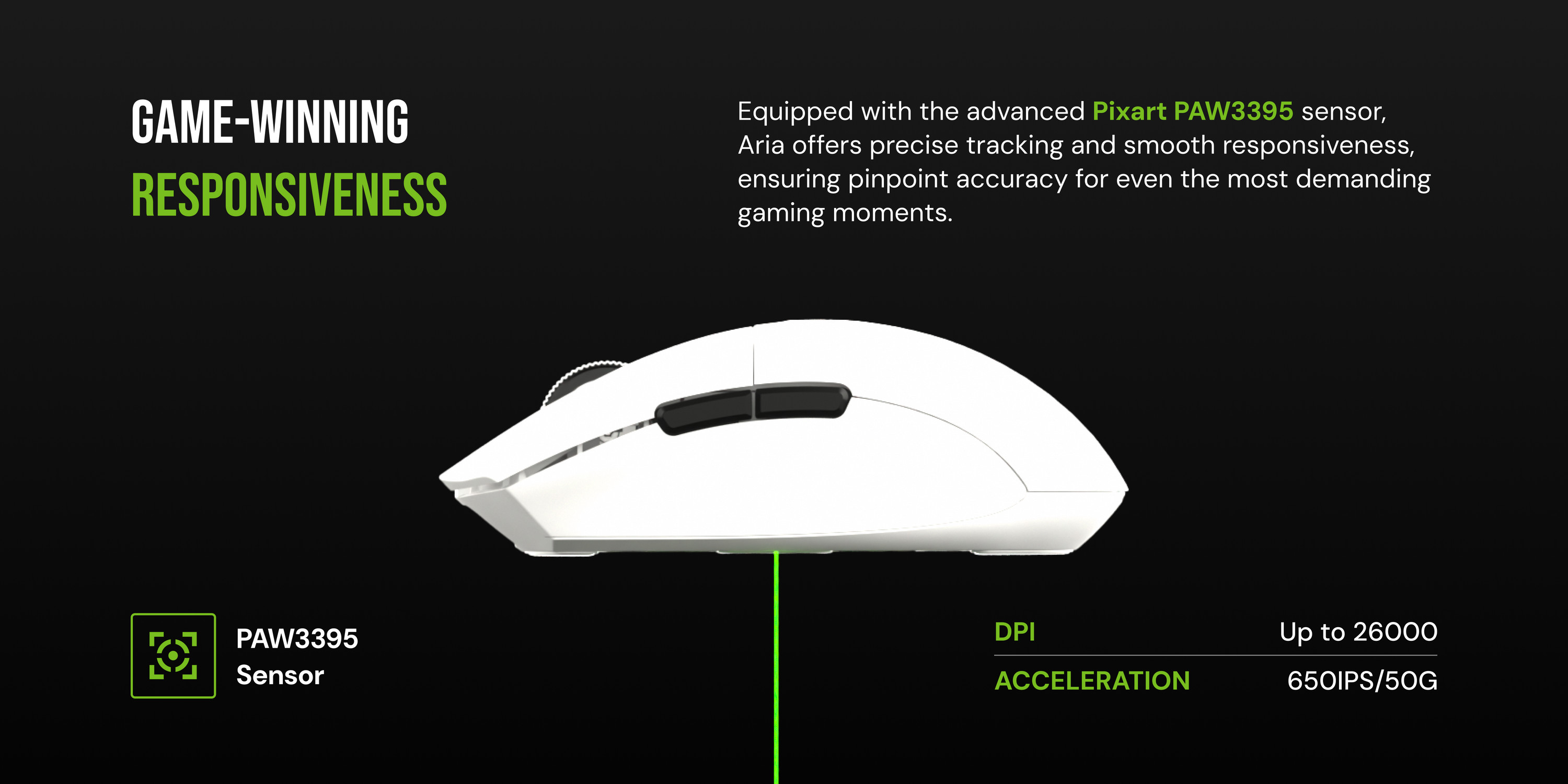 The ARIA is an egg-shaped gaming mouse designed for players who demand speed, accuracy, and comfort. Its PixArt 3395 sensor delivers pinpoint tracking, while the super lightweight 59g design allows for effortless flicks and minimal fatigue during extended gaming sessions. With a 1000Hz polling rate, every click and movement is super responsive, supported by durable Kailh GM8.0 switches and a smooth TTC Gold scroll wheel encoder. The Huano black shell side and scroll switches, white dot for the sides and blue dot for the scroll, ensure reliable performance without distractions.